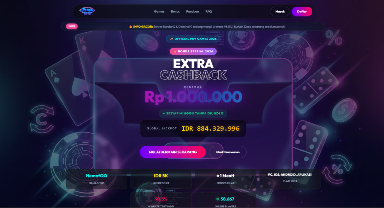 Akses daftar pkv games sekarang untuk menikmati meja poker online dan qq poker dengan winrate tertinggi. HematQQ memfasilitasi transaksi deposit withdraw kilat 24 jam melalui bank lokal dan e-wallet terlengkap. Di platform pkv qq ini, peluang mendapatkan jackpot global terbuka lebar hanya dengan satu User ID. Dukungan CS profesional kami siap membantu kendala anda kapan saja. Klik link daftar pkv games ini, klaim bonus menarik, dan buktikan kualitas server premium kami.